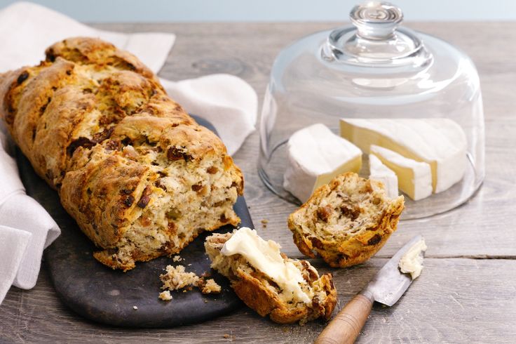 - Фруктовый хлеб нарезать небольшими ломтиками. Положить сверху на кекс декоративно вырезанную розетку сыра Тет-де-Мойн, немного посыпать чёрным перцем.