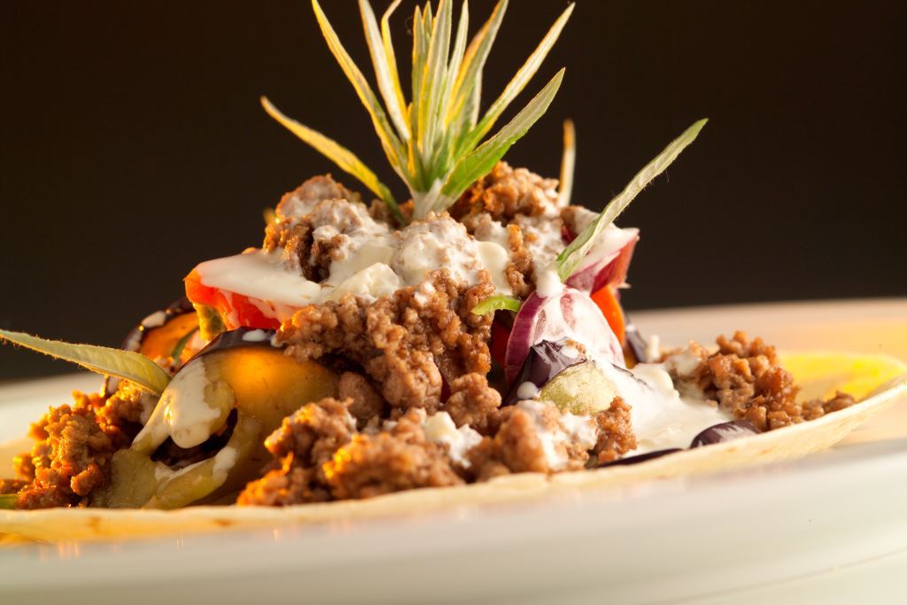 Лаваш с пряным бараньим фаршем и жареными баклажанами