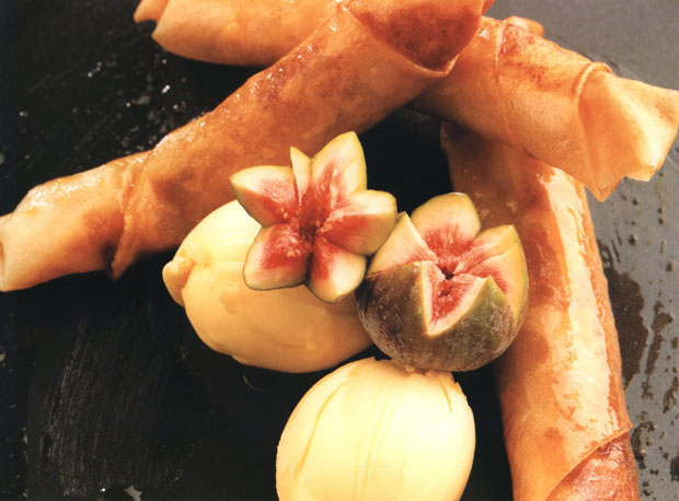 - Начинку выложить на тесто и распределить как можно более тонким слоем. Обжаривать в сковороде при 180°С около 3 минут. Сразу же покрыть карамелью из меда и топленого масла. Подавать микадо с мороженым.