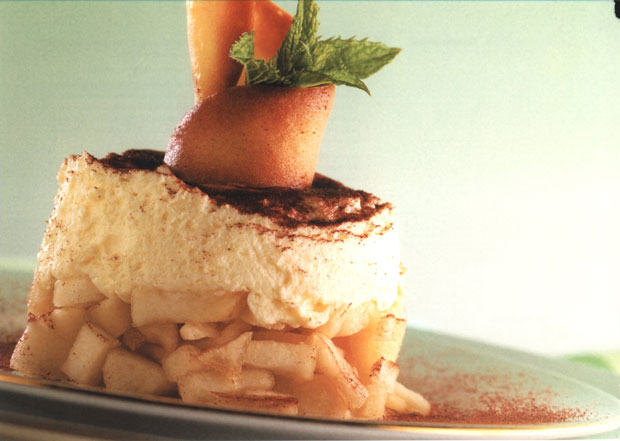 - В круглую форму выложить слой груш, затем слой маскарпоне. Снова держать в холодильнике до затвердения.