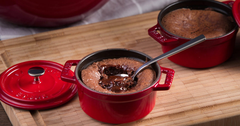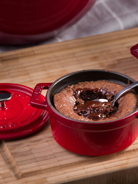 - Взбить белки в плотную пену и ввести их в приготовленную массу. Аккуратно перемешать. Выложить массу в мини кокотницу Staub. Поставить в слабонагретую духовку на 10 минут, затем увеличить нагрев и запекать еще 20 минут. Подавать тотчас.