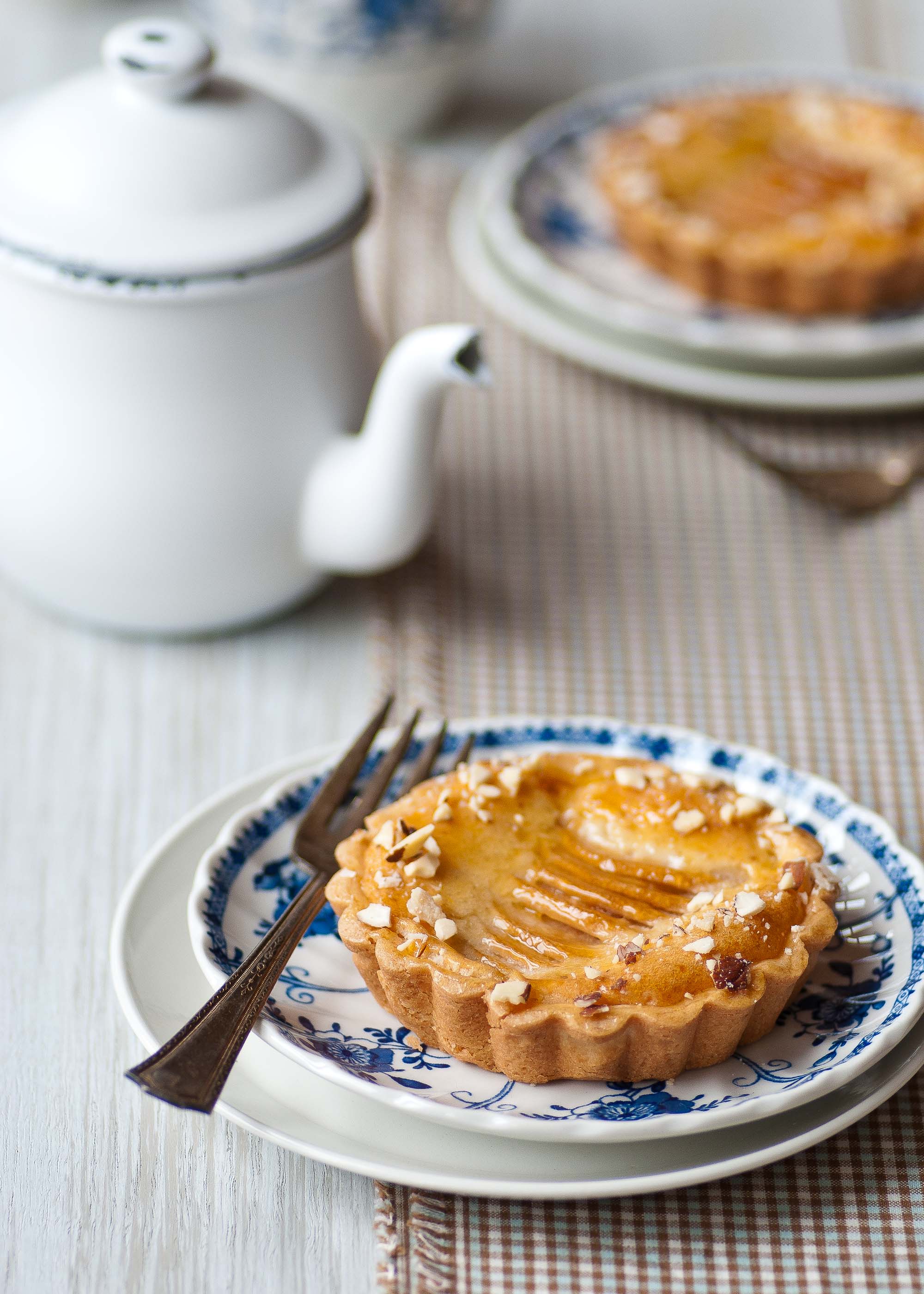 - В каждую готовую формочку с тарталеткой влить приготовленную ранее начинку. Сверху аккуратно выложить ломтики груши. Выпекать в духовке 25-30 минут при 175°С. Вынуть тарталетки из формочек. Посыпать сверху мелко нарезанными грецкими орехами.