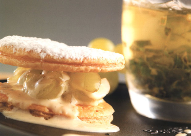 Для того чтобы сделать желе, обычно сначала разогревают жидкость. Здесь мы не разогреваем вино, чтобы оно не потеряло свой вкус. Не растягивайте слоеное тесто, т.к. в духовке оно сожмется до первоначального размера. Секрет в том, чтобы сразу нарезать большие тарталетки.