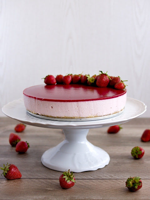 В миску налейте голодную воду, насыпьте туда 4 г желатина, перемешайте и оставьте на 5 минут пускай набухнет. - В кастрюлю налейте вторую часть клубничного пюре и поставьте его на плиту, доведите до кипения и снимите. Добавляем туда желатин и перемешать хорошо пока желатин полностью не растворится. Пускай клубничное желе немного остынет и тогда заливаем сверху аккуратно по сливочному сыру и отправляем в холодильник по крайней мере на 4 часа или на ночь.