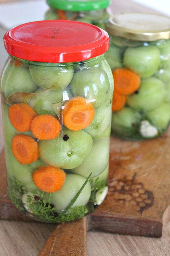 Зеленые помидоры, нарезанные кружочками, законсервированные с луком