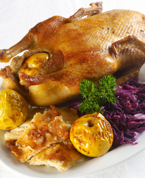 - Из готового гуся удалить нитки, вынуть ложкой яблоки, поместить их на блюдо, гуся разрубить и уложить на яблоки. Таким же способом готовят утку с яблоками.
