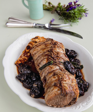 - Готовую корейку вынуть, нарезать тонкими ломтями, уложить на блюде, украсить черносливом. Все это залить соусом. Подавать с картофелем, краснокочанной капустой, заправленной вином.