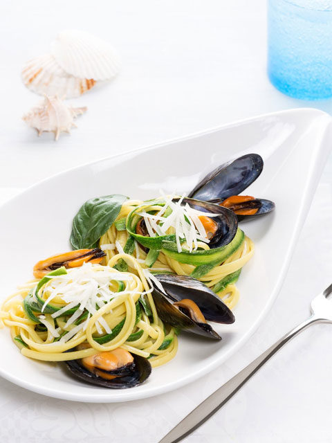 К цуккини и мидиям добавьте лингвины и несколько ложек оставшейся води которая осталась с варки. Поставьте на огонь, перемешайте, добавьте тертый сыр Пекорино и снова хорошо вымешайте.