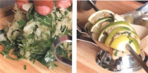 - Лайм очистить и нарезать тонкими ломтиками. Насадить рыбу и лайм на шампуры. Чтобы шашлыки не переворачивались сами, лучше использовать по 2 шампура.
