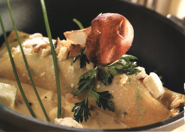 - В смазанной сливочным маслом горячей сковороде нажарить небольших блинов.Обжарить лук-шалот и давленый чеснок в сливочном масле. Увеличить огонь и добавить мелко покрошенных грибов. Влить вино и готовить несколько минут. Заправить солью и перцем, грибы откинуть шумовкой и разложить на блины. Блины завернуть и поместить на противень, смазанный сливочным маслом.