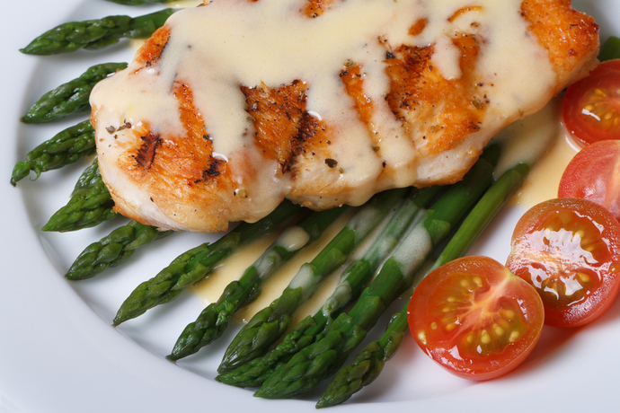 - В небольшие глубокие пиалы выложить куриное филе, залить соусом, по краям поставить стебли спаржи.