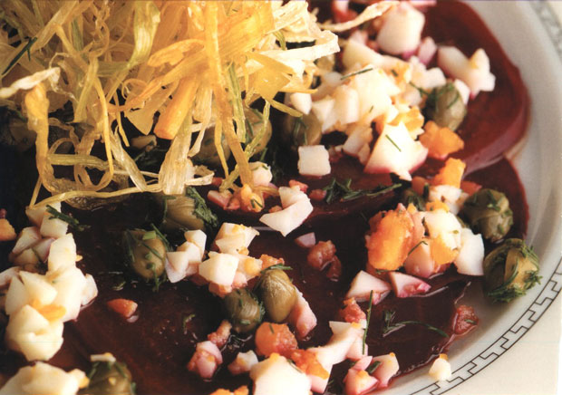 - Выложить нарезанную свеклу на тарелки. Обрызгать уксусом. Посыпать каперсами, яйцом и укропом. Лук промыть и нарезать тонкой соломкой. Несколько секунд бланшировать в кипящей воде и немедленно вынуть. Стряхнуть воду и глубоко прожарить до появления хрустящих свойств при температуре 160°С. Дать стечь на бумажное полотенце и украсить блюдо на тарелке.