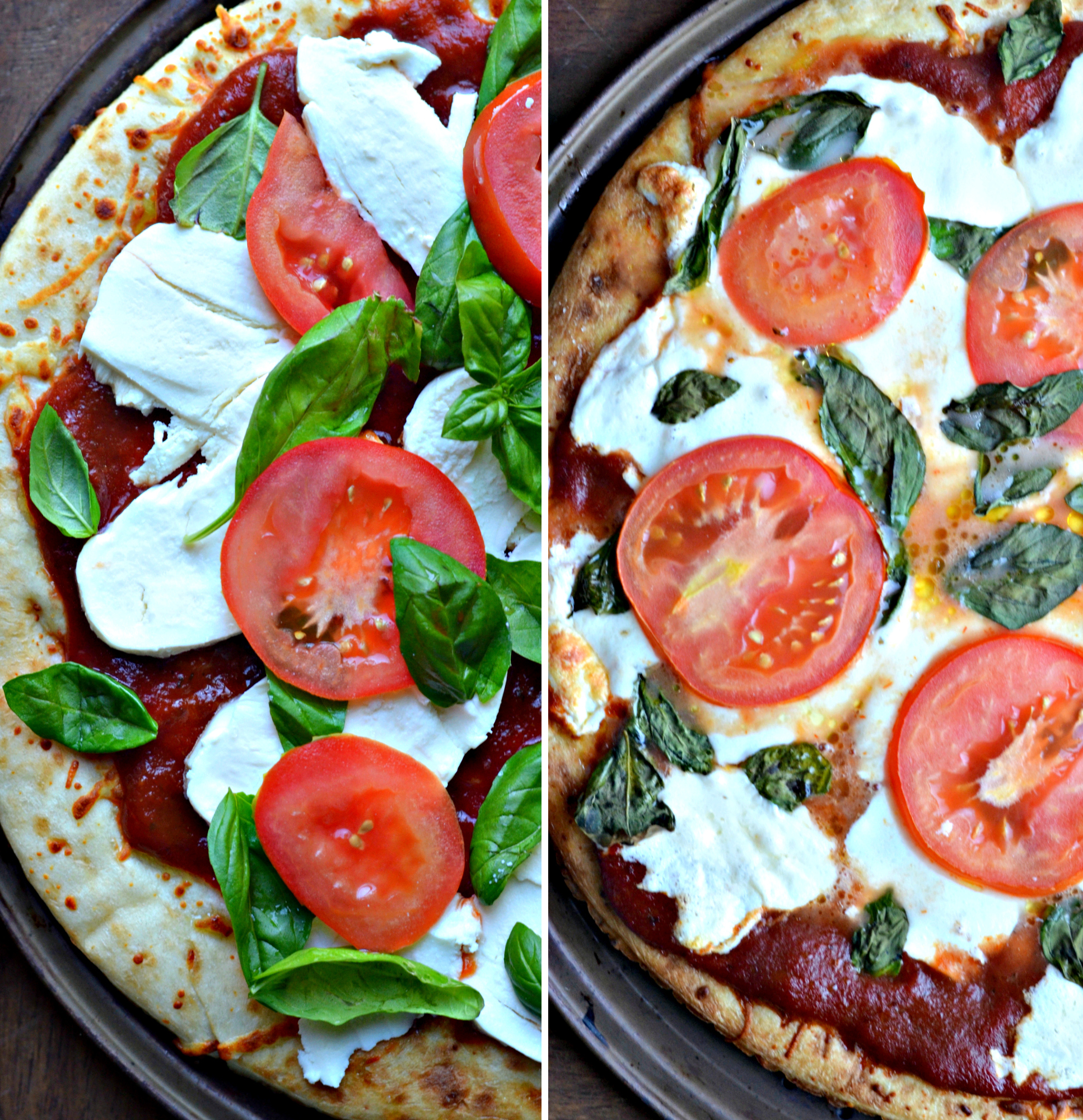 - Смазать тесто оливковым маслом, сверху равномерно распределить соус. Разложить по очереди кружечки помидоров и сыра. Посыпать пиццу итальянскими травами, немножко посолить, положить листочки свежего базилика, взбрызнуть сверху оливковым маслом. Выпекать пиццу 8-10 минут. Подавать горячей.