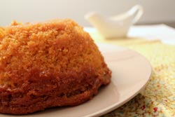 - Готовый пудинг выложить на тарелку и залить маслом, в котором предварительно спассеровать оставшуюся булочку.