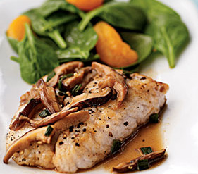 - Готовую рыбу положить на нагретое блюдо. На каждую порцию положить шампиньоны.