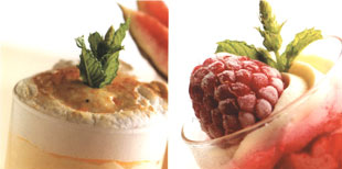 - Для жидкого теста: смешать творог со взбитыми сливками, яичным желтком, сахаром и лимонным соком. Тесто разделить на три части и добавить шоколад, протертую малину и водку. Возьмите 12 разных стаканов. Из воды, лимонного сока и сахара сделайте глазурь. Края стакана надо окунуть в глазурь и обжечь на газу до получения твердой карамели. Наполните стаканы тестом на водке. Украсьте инжиром, малиной и мятой. Держите в холодильнике.