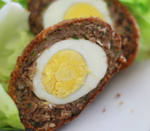 - На кухонной доске, посыпанной сухарями, разделать из мяса прямоугольник, вложить в середину (вдоль прямоугольника) два целых вареных очищенных яйца. Свернуть мясо толстым рулетом, положить на небольшую сковороду с разогретым жиром, полить сверху маслом, вставить в горячий духовой шкаф. Жарить около 40 минут, поливая соком, образовавшимся при жаренье. К соку добавлять воду.
