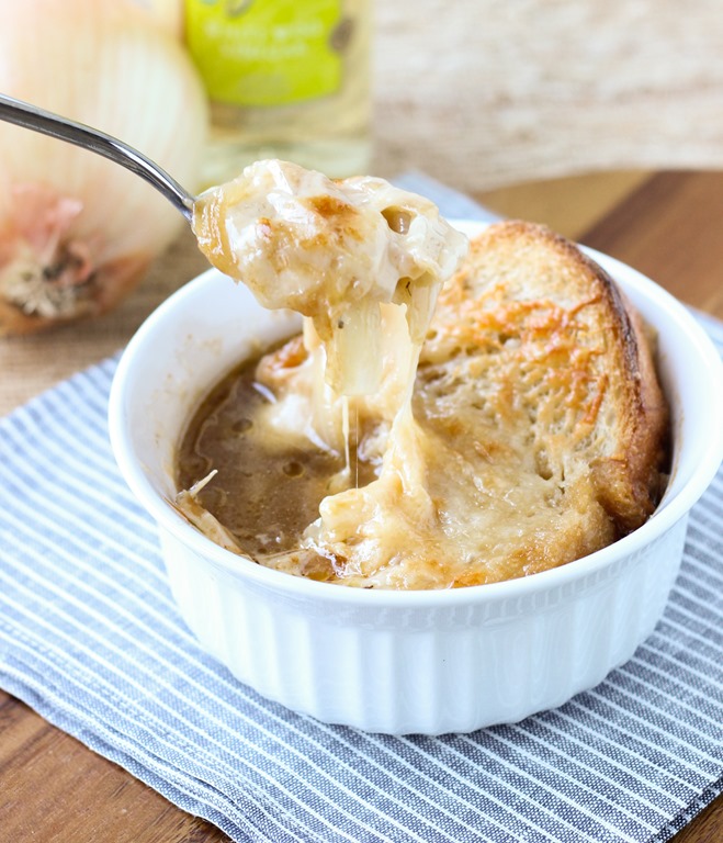 Разогреть мясной бульон, добавить к нему приготовленный лук. Добавить вино и варить 30-40 минут.