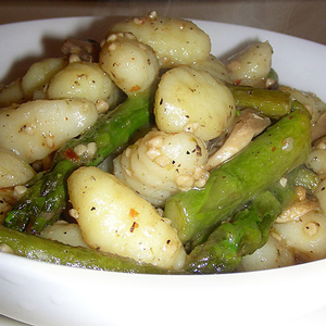 - Спаржу и картофель перемешать с соусом, прибавить половину зеленого лука, положить в стеклянный салатник. Посыпать зеленым луком, украсить головками спаржи