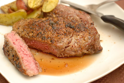 - На большой сковороде сильно разогреть жир. Мясо посолить, посыпать перцем, сразу же положить на горячий жир и поджаривать каждую сторону 3-4 минуты до образования румяной корочки; внутри мясо должно быть розовым.