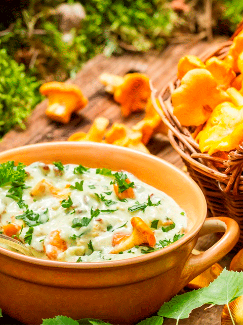 Аппетитное горячие блюдо из необычно вкусных и ароматных лисичек с нежным сливочным соусом.