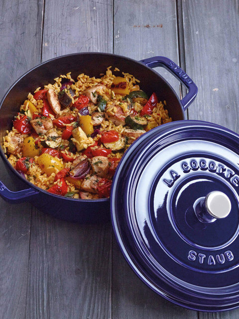 - Через 15 минут, добавить обжаренные овощи и курицу к рису и тушить еще 5 минут. Затем снимите кокотницу с огня, слегка приоткройте крышку и дайте воде испарится в течении 10 минут.