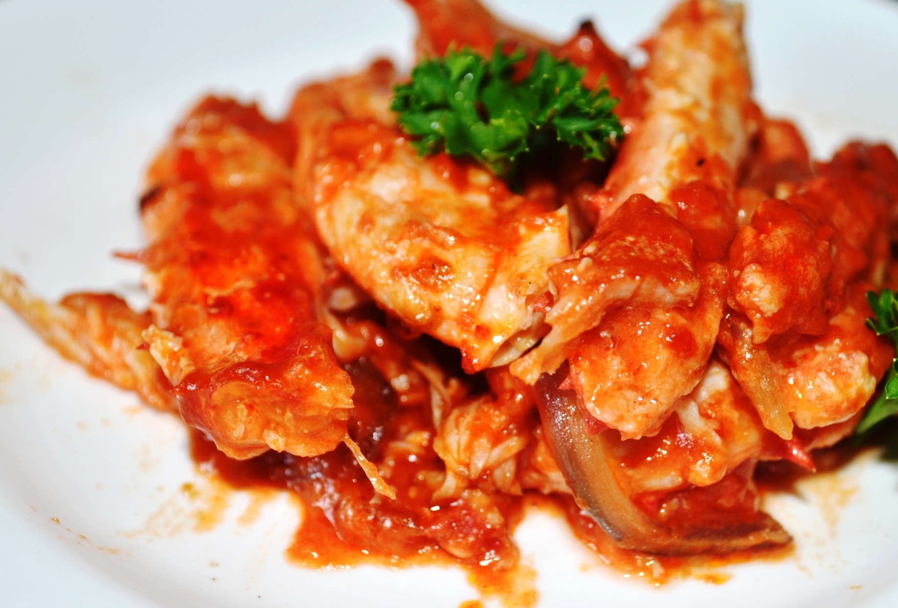 - На смазанную маслом сковороду положить слой филе, намазать смесью томатного соуса, горчицы, соли, мелко нарезанного лука, сверху опять положить филе и т. д.