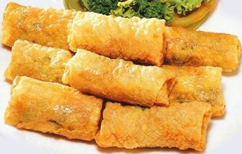 - Каждый блинчик смазывать начинкой, завернуть 2 края на 2-3 см. Сворачивать блинчики тугой трубочкой. Макать в тесто; обвалять в сухарях, обжарить с двух сторон на сковороде.